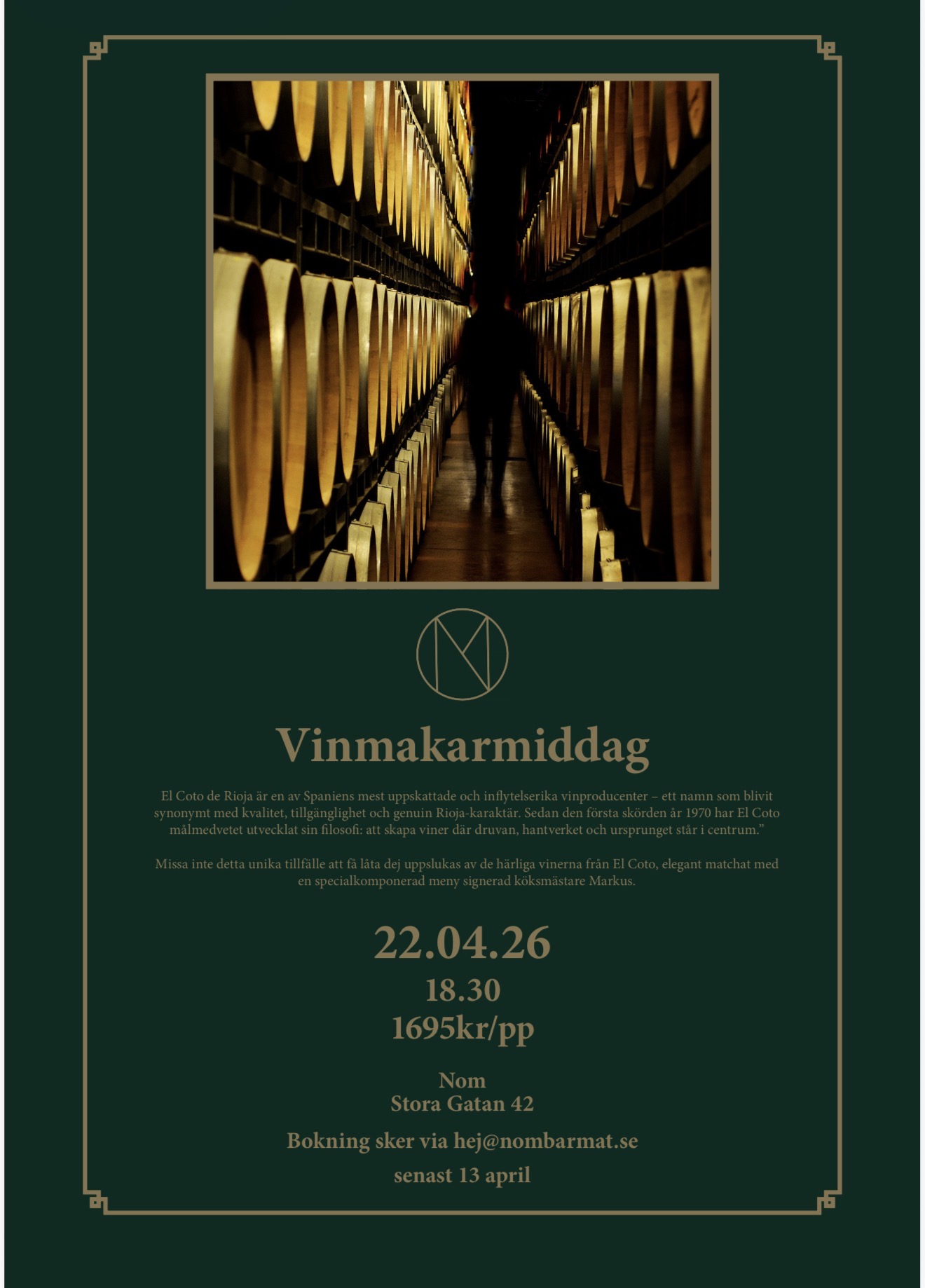 Missa inte detta unika tillfälle att få låta dej uppslukas av de härliga vinerna från El Coto, elegant matchat med en specialkomponerad meny signerad köksmästare Marcus